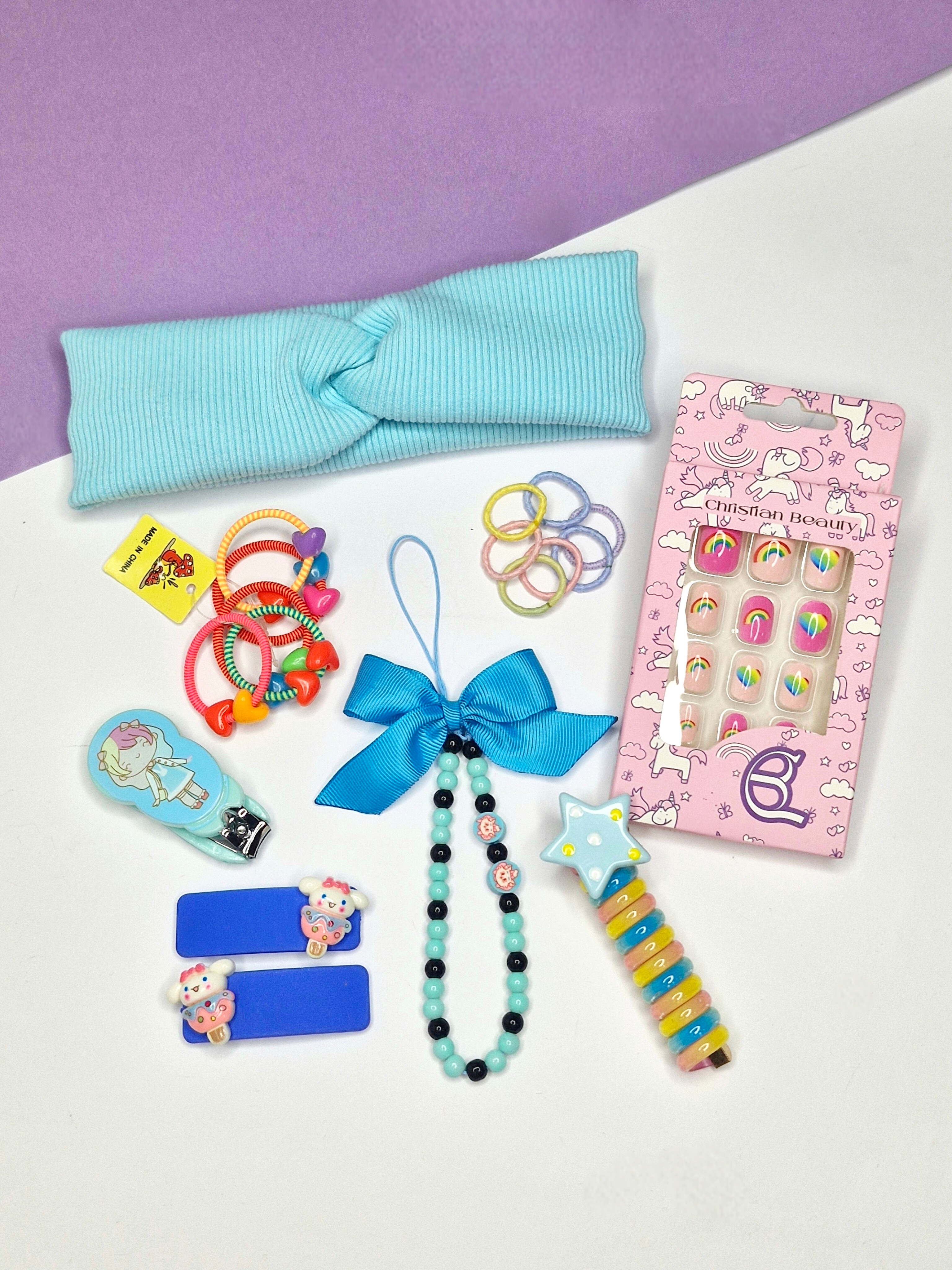 پک کادویی آبی شامل محصولات زیبایی همچون هدبند کبریتی گرهای دوطرفه، ناخن مصنوعی کودک طرح رنگین کمان، 7 عدد کش مو لیزری، پک کش مو قلبی، ناخنگیر کودک عروسکی، یک جفت گلسر تقتقی عروسکی، کش مو فنری رنگین کمونی و آویز مهرهای پاپیونی برا کیف یا موبایل میباشد.