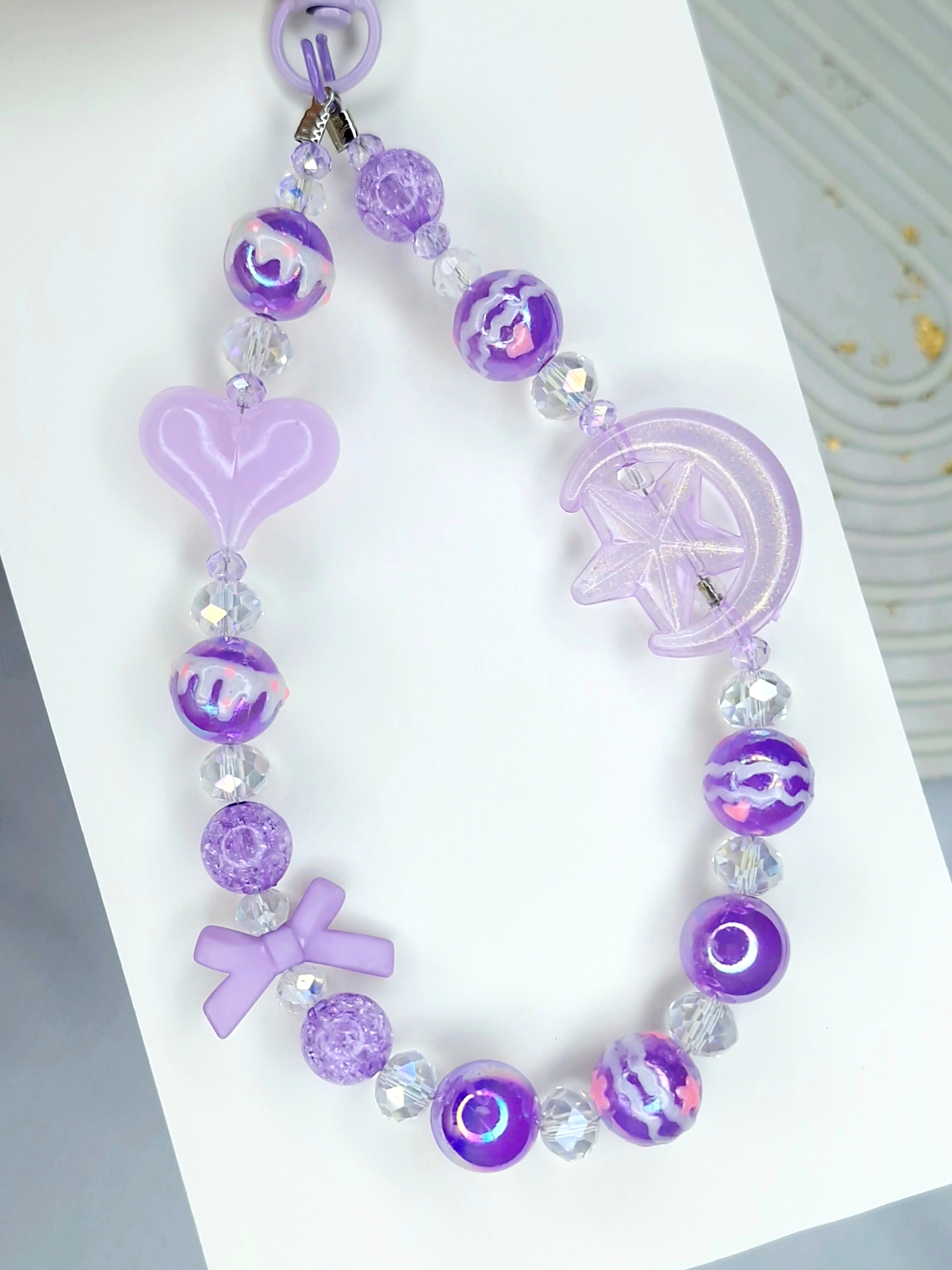 این فونچارم بنفش مدل ماه و ستاره دارای مهرههای طرحدار، قلبی و پاپیونی در کنار کریستالهای شفاف میباشد که زیبایی آن را دوچندان نموده است.
